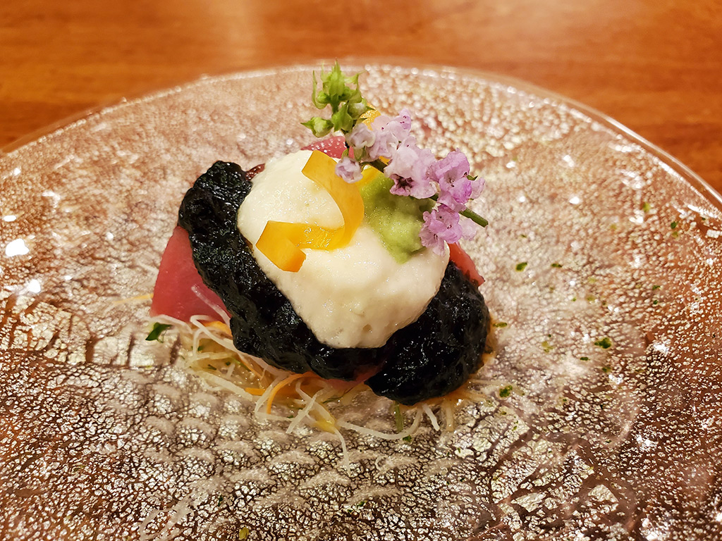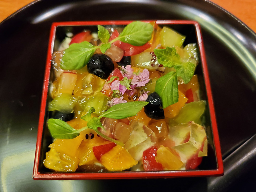 ・蛸柔らか煮天 白ダツ フルーツトマト アボガド掛け ミントジュレ