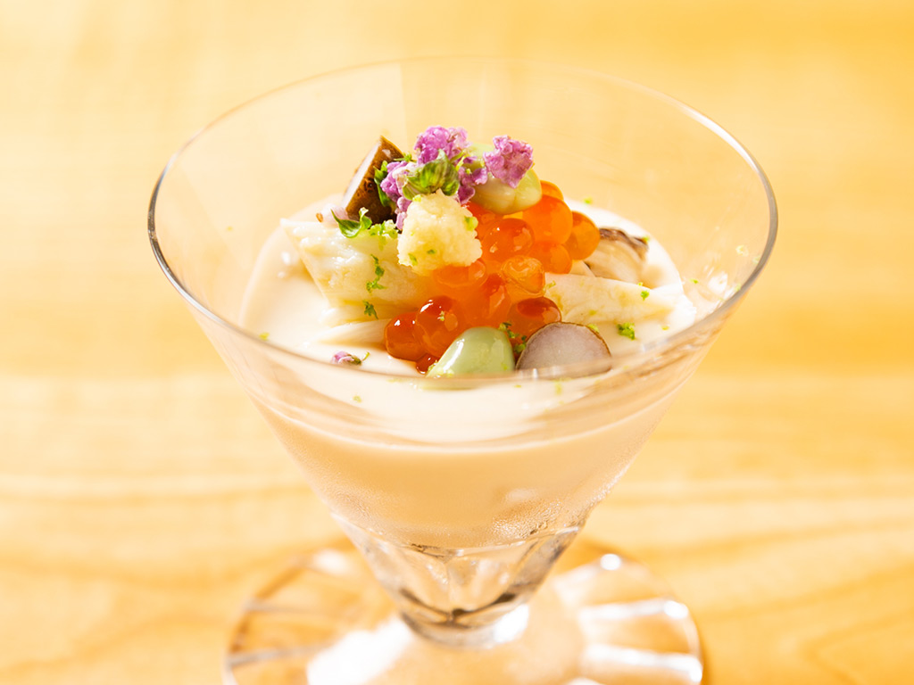 ・湯葉すり流し 菱蟹 白ダツ 栗 むかご いくら