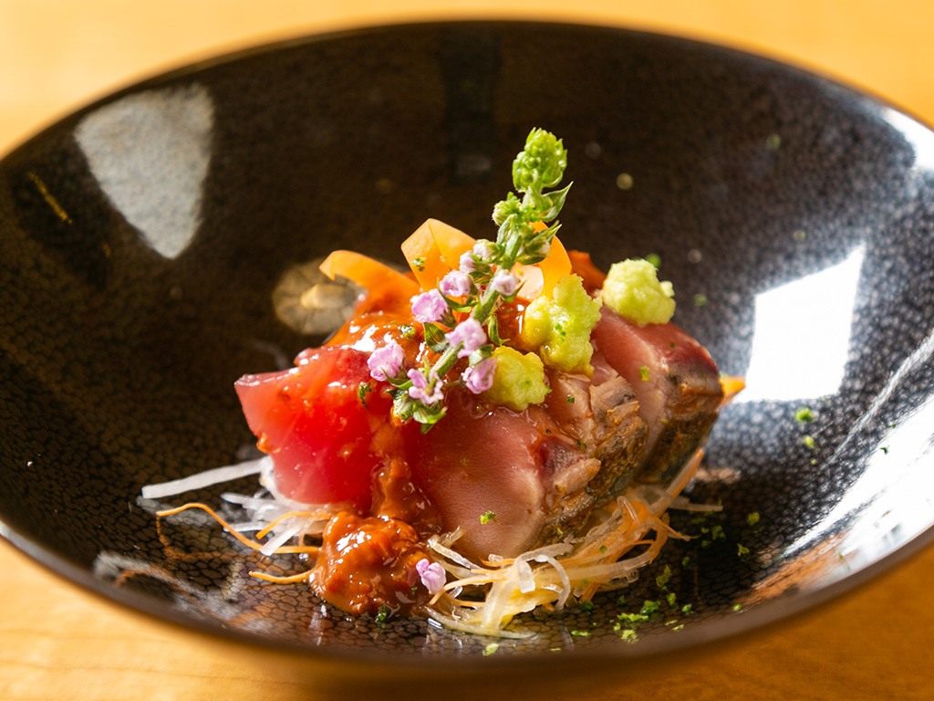 ・よこわ鮪 もろみ醤油 黄身がけ