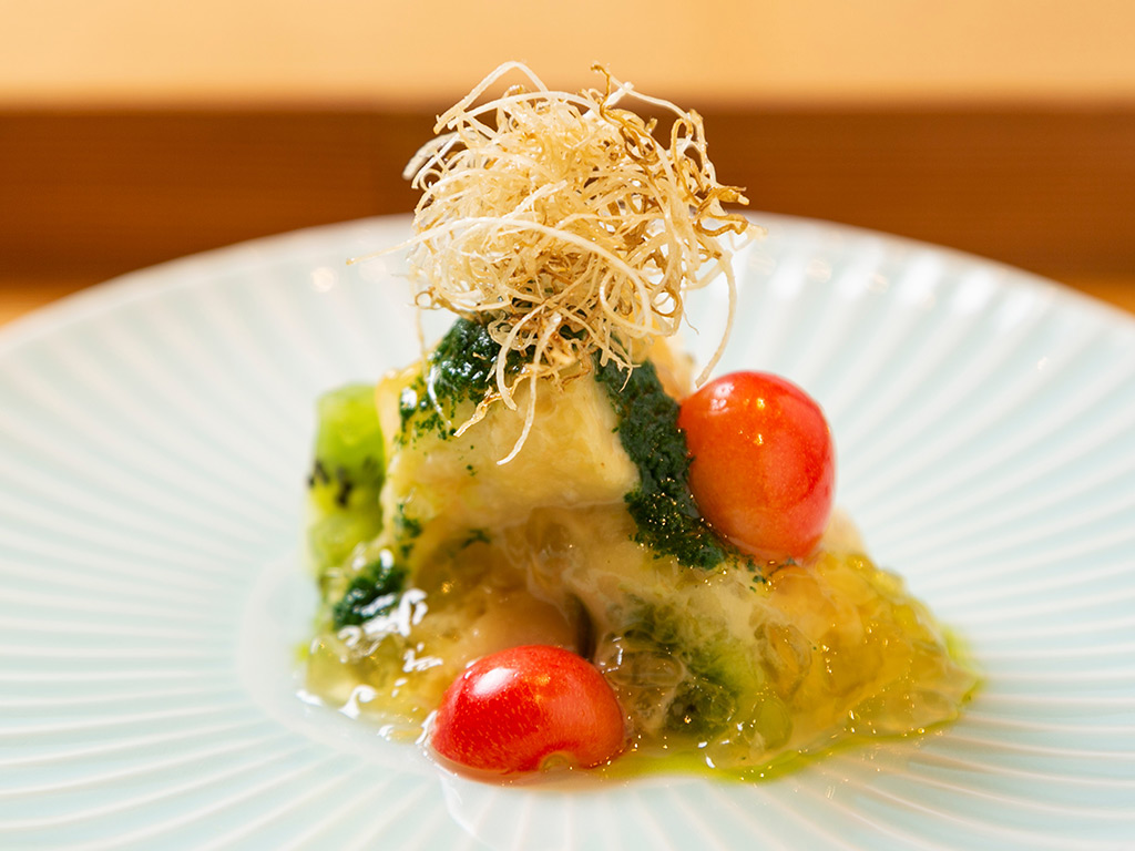 鮎塩焼 川海老 鴨ロース 蕨白和え 一寸豆 - 焼物